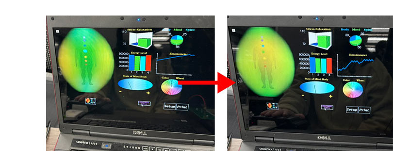 お子様を測定をすると7つチャクラが真ん丸〇揃う事が多いです。この方は綺麗な黄色のオーラを放ってまますが、チャクラの様子がバラバラと言っていいほど乱れていました。大人になるとケガレがどうしても出てきます。サリザーで調整するとご覧の通りチャクラの整いました。