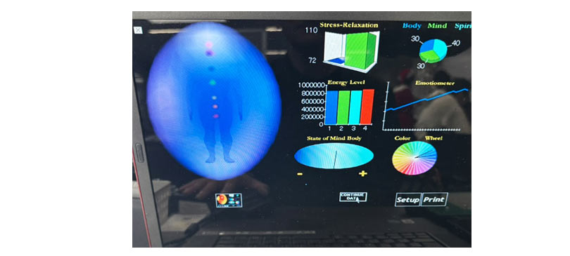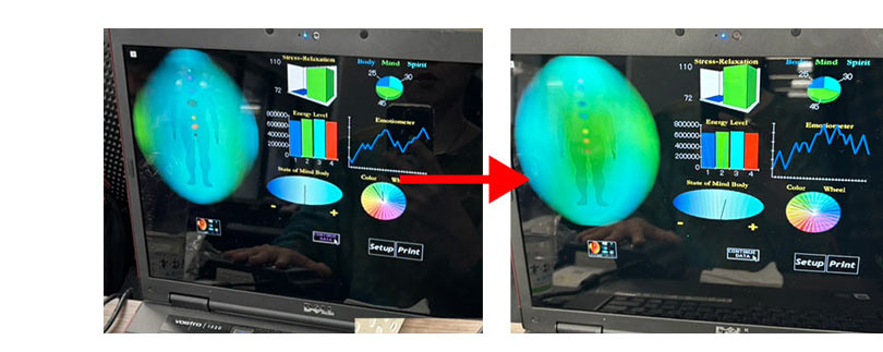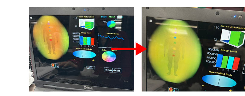 オーラのベースカラーは、それぞれの個性と同じく十人十色です。観て頂きたいのはチャクラの粒が整ってきていることです。 この方の場合、チャクラが全体的ににじんでいましたが、レベルのつまみを調整してもらうと、見事に整ってきました。